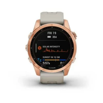 La Fénix 7S solar est la meilleure amie de tous les sportifs. Suivi de santé, d’hydratation, de bien-être ou encore suivi de performances, coach d’entrainement, aide à la glisse pour le surf et le kite surf et même GPS pour le Ski, la randonnée, le trail, l’alpinisme le golf, et bien plus encore, elle est excellente dans tous les domaines. Si vous êtes un sportif qui est aussi à l’aise dans des chaussures de villes que dans des chaussures de sport, les fonctionnalités telles que le Garmin Pay, les notifications du téléphone ou encore la musique sauront vous combler. - COULEUR : Rose Gold bracelet beige